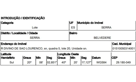 RUA DIVINO DE SAO LOURENCO,N. S/N QD 05, LT 20, BELVEDERE - CEP: 29180-049, SERRA - ESPIRITO SANTO