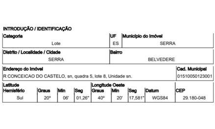 RUA CONCEICAO DO CASTELO,N. S/N QD 05, LT 08, BELVEDERE - CEP: 29180-048, SERRA - ESPIRITO SANTO