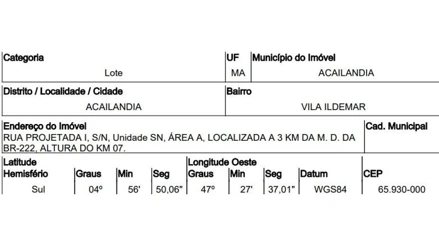ROD BR 222,N. SN KM 07, VILA ILDEMAR - CEP: 65930-000, ACAILANDIA - MARANHAO