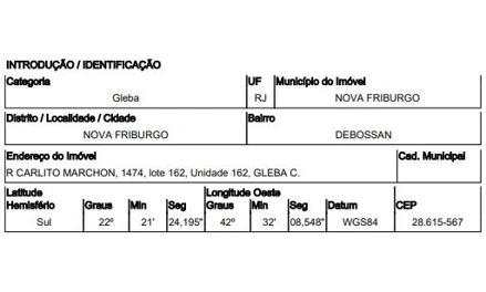RUA CARLITO MARCHON,N. 1474 GL C LT 162, DEBOSSAN - CEP: 28615-567, NOVA FRIBURGO - RIO DE JANEIRO
